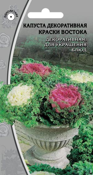 КАПУСТА КРАСКИ ВОСТОКА Декоративная, для украшения блюд Среднепоздний (110–114 дней) сорт для использования в свежем виде, украшения блюд и в качестве декоративного растения. Розетка листьев полураскидистая, высотой 25–40 см, диаметром 35–55 см. Лист округлый, сильноволнистый по краю. Окраска листьев серо-зеленая (внизу), плавно переходящая в красно-фиолетовую (в центре), центральная жилка фиолетовая. Используют для одиночных и групповых посадок как обсадочное растение. Сорт устойчив к пониженным температурам, болезням и вредителям.