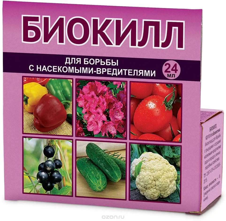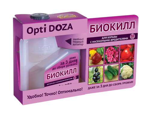 Биокилл - незаменимый препарат для защиты растений от вредителей в период, когда до сбора урожая осталось совсем мало времени. Имеет широкий спектр действия: против более 20 видов насекомых вредителей, в том числе колорадского жука, капусной белянки, капусной совки, паутинного клеща, яблонной плодожорки, цветоедов, трипсов, всех видов тли.