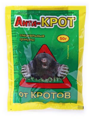 Для тех, кто твердо намерен избавится от кротов на своем участке, разработан уникальный препарат — специальные гранулы «Анти-КРОТ». Состав этой приманки подобран с учетом пищевых предпочтений крота, запах и вкус очень привлекательны для него. Специальная технология изготовления и включение в состав сильного действующего вещества гарантируют высокую эффективность в борьбе с кротом.