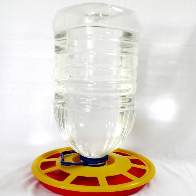 Поилка изготовлена из пластика, состоит из бачка-конуса и крышки-дна. Вода заливается в бачек,плотно закрывается крышкой и перевернув ставится на нее. Подходит для цыплят и взрослой птицы.