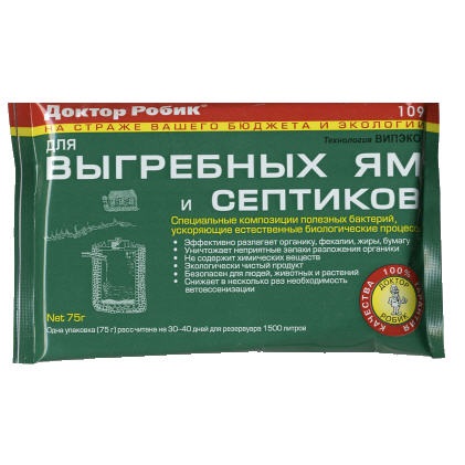 Доктор Робик для выгребных ям и септиков – это средство для очистки септиков и выгребных ям от остатков бытовых отходов, загрязнений и ила. Использование данного средства в таких устройствах, как выгребная яма с переливом и выгребная яма из бетонных колец, предотвращает заиливание пор в земле. Благодаря препарату не образуются окаменелости и нерастворимые органические отложения в очистительных установках. Также данное средство ускоряет биологический процесс разложения ассенизационных стоков.В состав препарата входят специально отобранные культуры и микроорганизмы, которые утилизируют не только фекалии, но и бумагу, жиры, крахмал, белки, а также целлюлозу за короткое время.